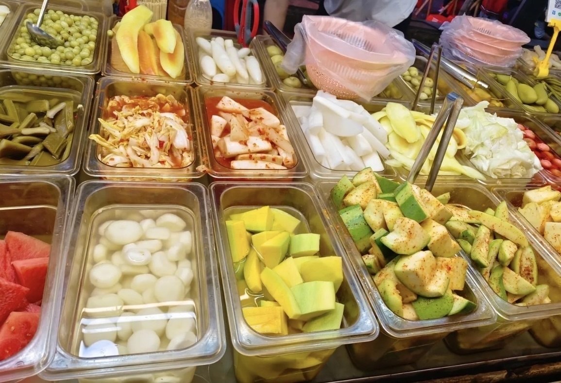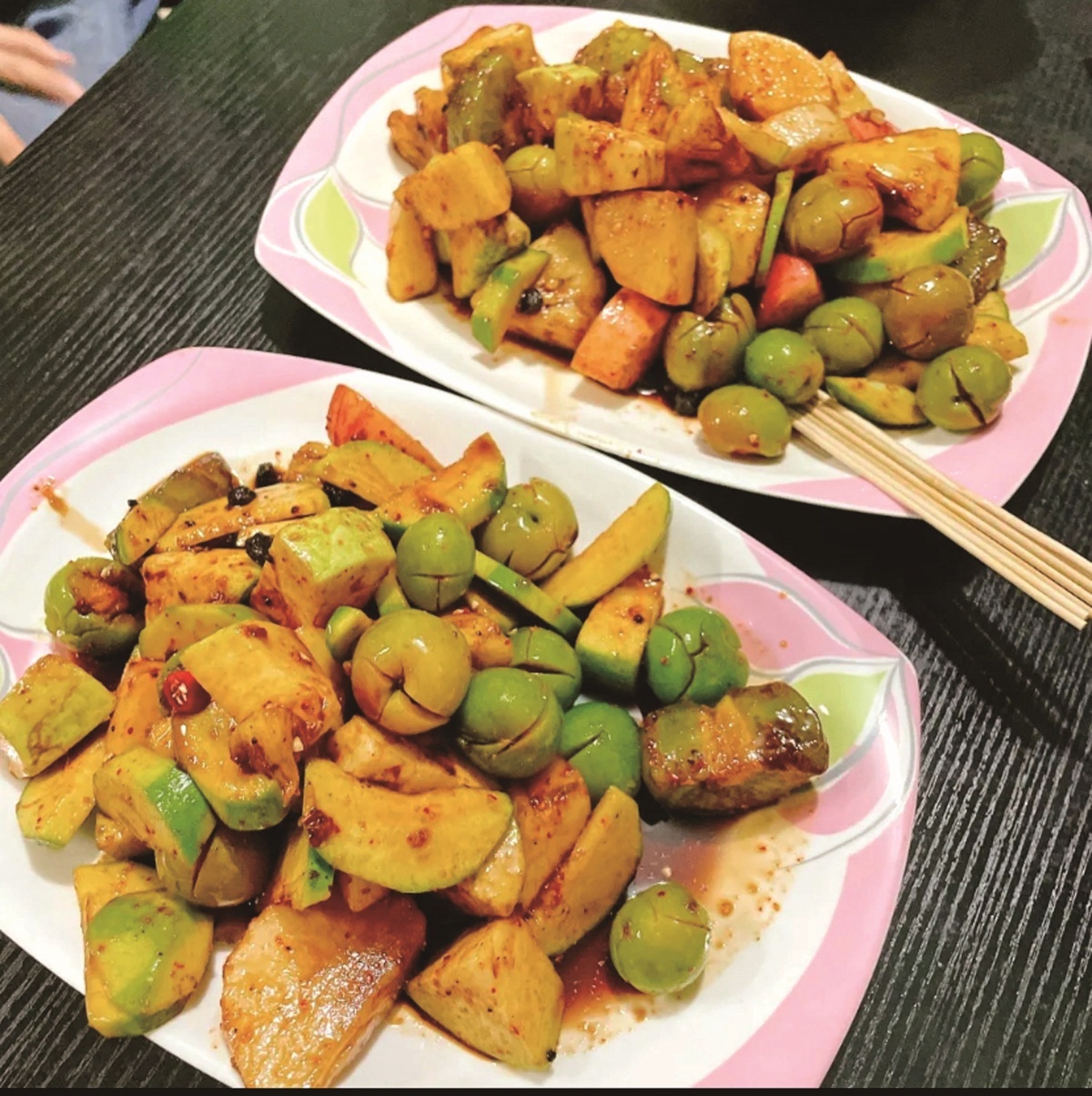 红糖酸嘢发源地广西网红芒果花。博白酸嘢,就是各种腌制的水果,芒果、菠萝、杨桃、番石榴、杨梅、三华李等,只要是水果,都能拿来腌制。方法也很简单,新鲜的水果洗净切块,使用一定配比适调的红糖汁腌酸,可以让本就酸辣爽口的酸嘢,又多了一道甜味,酸酸甜甜的味道,很是让人“上头”。博白酸嘢现点现做,十分讲求新鲜,客人到店挑选好,再现场进行拌料腌制,完美地保留了水果原有的鲜美,再加上特调的红糖汁,让人回味无穷。