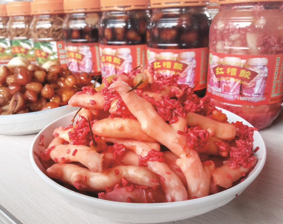 特色红糟酸,宴席不可或缺。在来宾市武宣县,红糟酸是餐桌上必不可少的特色美食。逢年过节、接待宾客时,端上一碗红糟酸才能显示隆重。用红糟腌制的嫩姜、辣椒、豆角、藠头、刀豆、菜梗等酸品,看着颜色殷红鲜艳,但放心,不添加任何色素,健康又美味。武宣红糟酸入口酸、甜、辣、香、脆兼而有之,酸爽可口。特别之处在于红糟酸水还可以当作佐料,用来烹饪红糟鱼、红糟大肠、红糟猪脚等菜肴,别有风味。红糟酸制作技艺并不简单,光是红糟的制作都需经过“三洗三晾三发酵”。松软并散发浓香的红糟做成后,才可放进酸坛腌酸菜。一层红糟、一层嫩姜或辣椒等,如此反复直至整个坛子放满。最后添加一些高度白酒,盖上盖子加水封坛。十余天后,即可吃上又脆又酸的红糟酸。