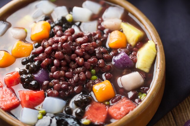 四果汤是闽南地区一道美味可口的名点,发源于福建闽南地区,其历史悠久,系福建闽南一带非常出名的特色小吃,兴于泉州、漳州一带,特点是味甜爽口,清凉解毒。漳州四果汤和厦门、泉州的四果汤不同,漳州四果汤早已不止只加四种料了,有的十几种料都有了,薏米、绿豆、红豆、莲子、白木耳、各种水果,如菠萝、西瓜等,有的还有蜜饯、仙草、芋圆、布丁、圆子、阿达子,还可选择加不加刨冰。 【 详细>>】