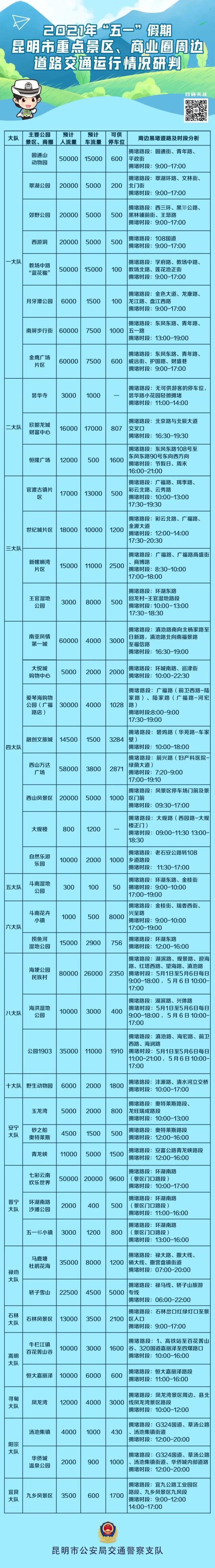 根据往年预测,今年“五一”假期期间,可能会出现人车流量大对周边交通较为影响的景区、商圈分别是: