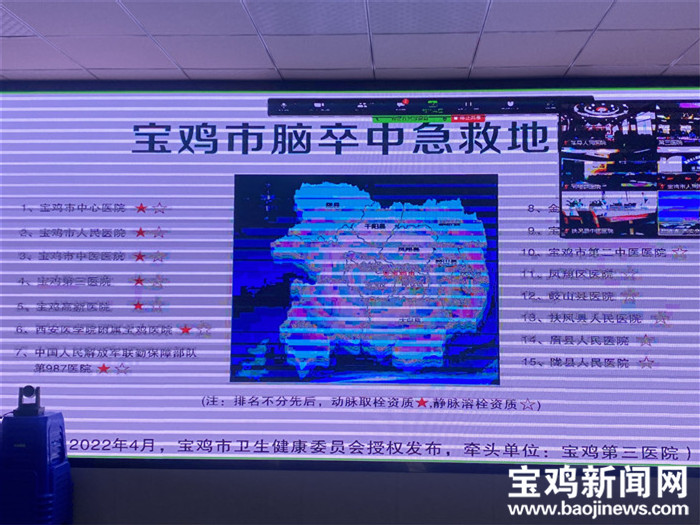 此次会议采取线上+线下的形式召开。会议通报了2021年省市两级卫健委对各医院卒中中心建设检查结果,宣读了市卫健委关于发布宝鸡市脑卒中急救地图单位的通知,发布了“宝鸡市脑卒中急救地图(1.0版)”,并对管理办法进行了解读。脑卒中急救地图的发布旨在打造脑卒中急救“黄金一小时”救治圈,建立分级救治与区域协同并举的区域脑卒中救治网络模式,对提升我市脑卒中救治水平起到了关键作用。
