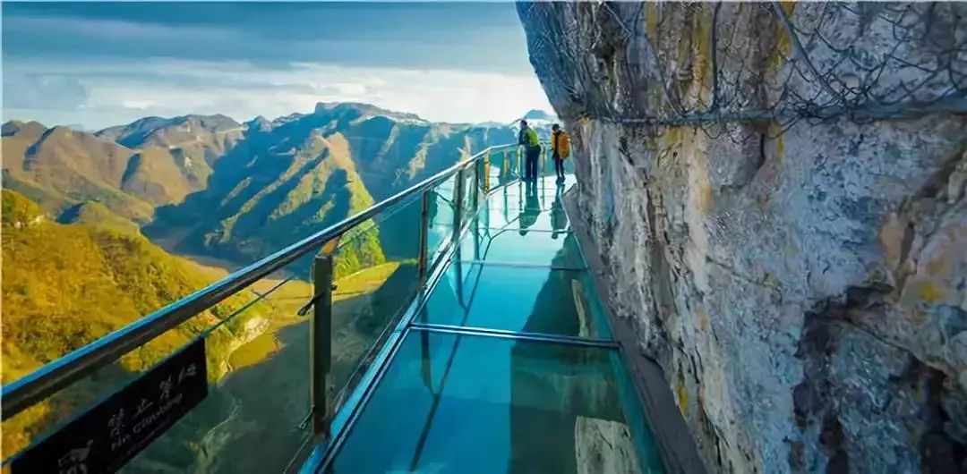 朱砂古镇的玻璃栈道建在悬崖之上,全长1055米,距离谷底100余米。站在上面,谷底风光尽收眼底,可真切体验凌空之感。