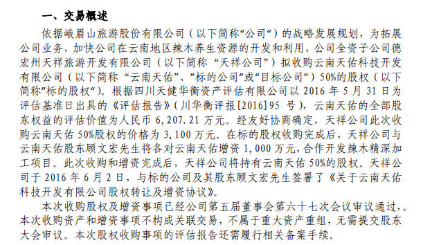 顾文宏与峨眉山A的渊源要追溯至2016年。2016年6月2日,天祥公司与标的公司及其股东顾文宏签署了《关于云南天佑科技开发有限公司股权转让及增资协议》,约定天祥公司收购云南天佑50%股权,交易价格为3100万元,同时股权收购完成后,天祥公司与顾文宏将各对云南天佑增资1000万元,合作开发辣木精深加工项目。