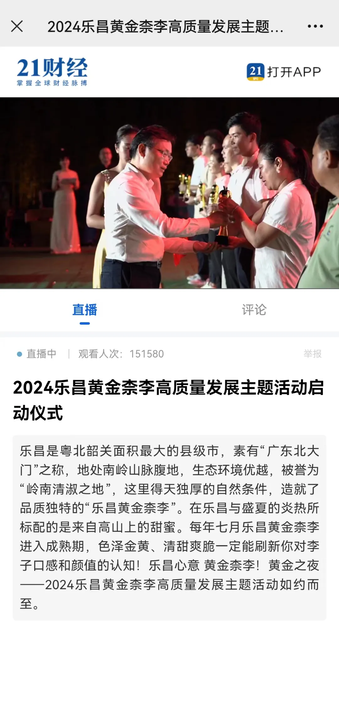 活动引起了社会各界的广泛关注,观看直播的观众纷纷为乐昌黄金柰李点赞,新华社、新华网、香港商报、广东电视台、南方财经集团、南方都市报、羊城晚报、韶关日报、韶关电视台等媒体对2024乐昌黄金柰李高质量发展主题活动和乐昌黄金柰李的丰收景象,通过短视频、推文、新闻报道等多种形式进行全面宣传。