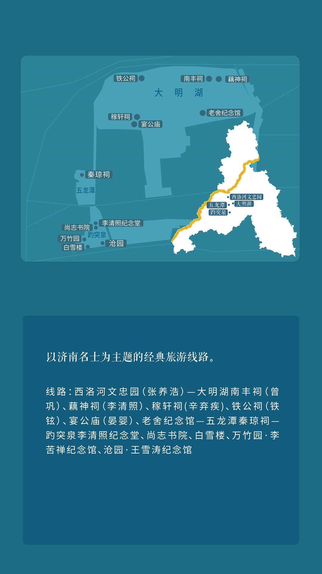 线路:西洛河文忠园(张养浩)—大明湖南丰祠(曾巩)、藕神祠(李清照)、稼轩祠(辛弃疾)、铁公祠(铁铉)、宴公庙(晏婴)、老舍纪念馆—五龙潭秦琼祠—趵突泉李清照纪念堂、尚志书院、白雪楼、万竹园·李苦禅纪念馆、沧园·王雪涛纪念馆