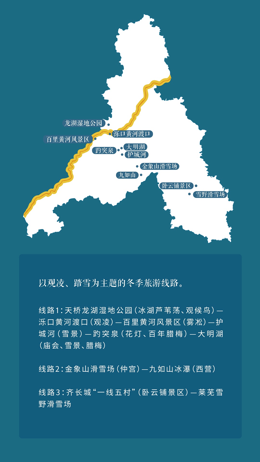 线路1:天桥龙湖湿地公园(冰湖芦苇荡、观候鸟)—泺口黄河渡口(观凌)—百里黄河风景区(雾凇)—护城河(雪景)—趵突泉(花灯、百年腊梅)—大明湖(庙会、雪景、腊梅)