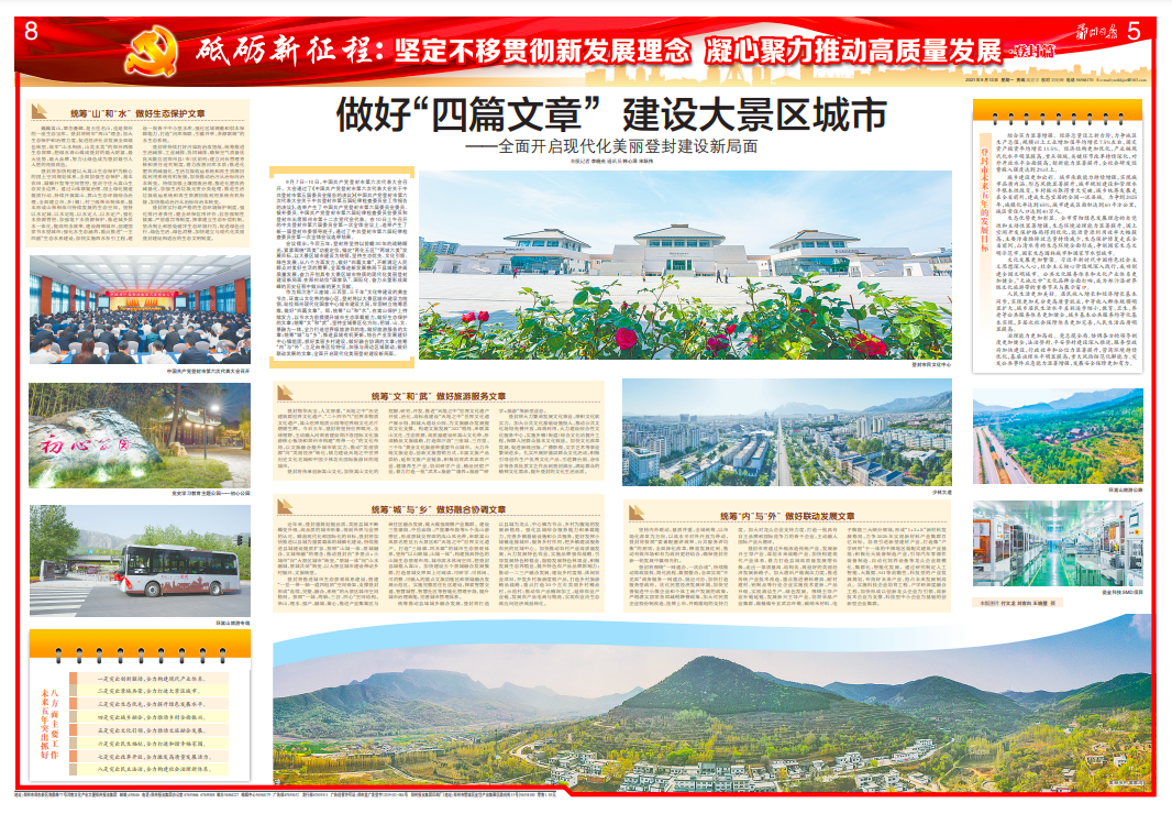 作为郑汴洛“三座城、三百里、三千年”文化带建设的黄金节点、环嵩山文化带的核心区,登封将以大景区城市建设为统领,站位郑州现代化国家中心城市建设大局,牢固树立统筹思维,做好“四篇文章”。即,统筹“山”和“水”,在嵩山保护上持续发力,以节水为前提提升城市生态承载能力,做好生态保护的文章;统筹“文”和“武”,坚持全域景区化方向,把城、山、文、景融为一体,全力打造世界级旅游目的地,做好旅游服务的文章;统筹“城”与“乡”,推进县城有机更新,结合产业发展建好中心镇组团,抓好美丽乡村建设,做好融合协调的文章;统筹“内”与“外”,立足自身区位特征,加强与周边区域联动,做好联动发展的文章,全面开启现代化美丽登封建设新局面。