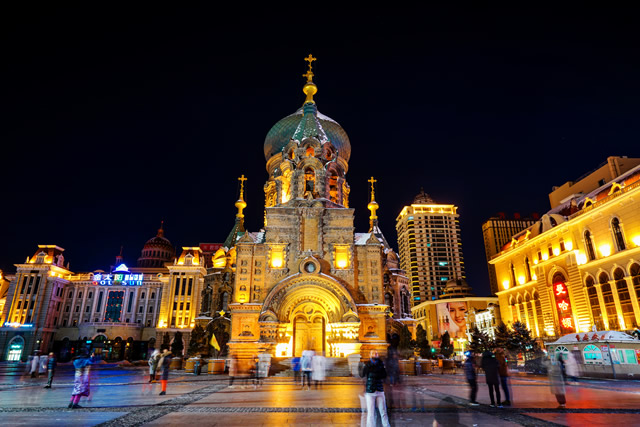 圣·索菲亚教堂为哈尔滨的标志性建筑,也是哈尔滨必去网红景点之一,曾被美国CNN评为中国最美的40个景点之一。整座教堂为庭式建筑,中央一座主体建筑有个标准的大穹窿,红碑结构,巍峨宽敞。教堂前广场上的和平鸽静静站立在教堂斑驳的红色墙砖上,红白鲜明对比,为教堂增添了一笔神圣的色彩,散发出浪漫的气息。与白天相比,教堂的夜景更美丽,每当夜幕降临时,在灯光的承托下,教堂更显得雄伟神秘,充满异国情调。 【 详细>>】