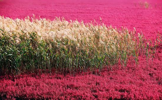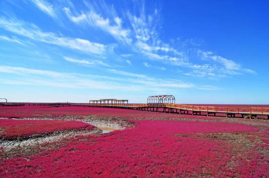 每年10月,红海滩便会迎来最热烈的季节,碱蓬草生长最旺,和落日共同构成了一幅绝美的画卷。