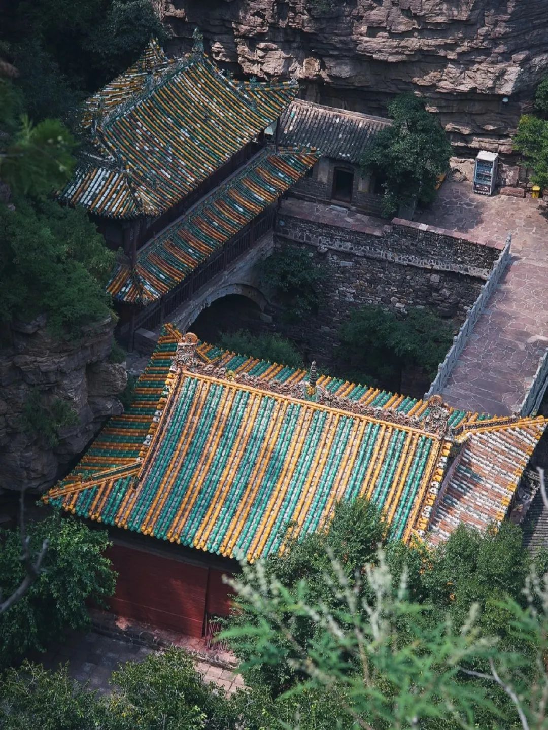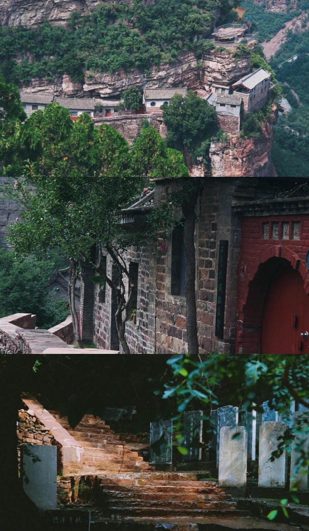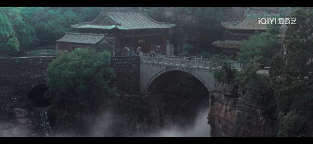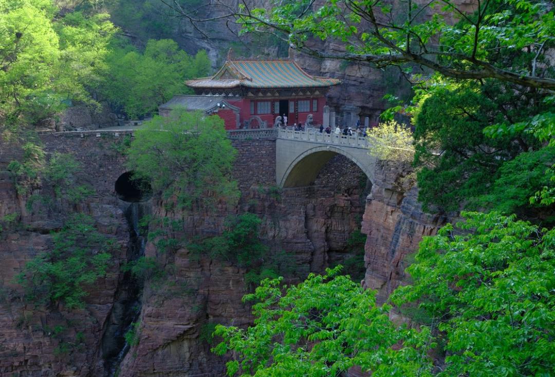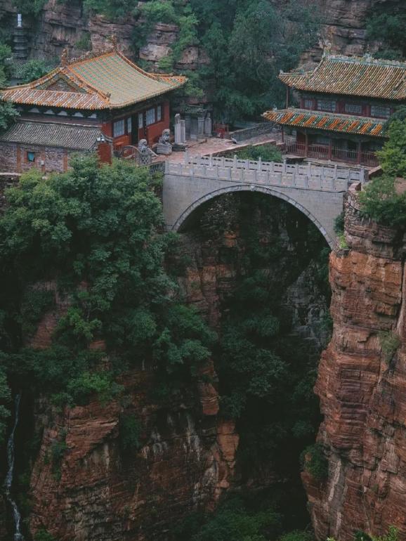 走入寺内,两壁断崖之上,凌空架着三座单孔石拱桥,桥上建有楼殿,从山下仰望,整座桥楼仿佛凌驾在云雾之上,如同仙境一般。