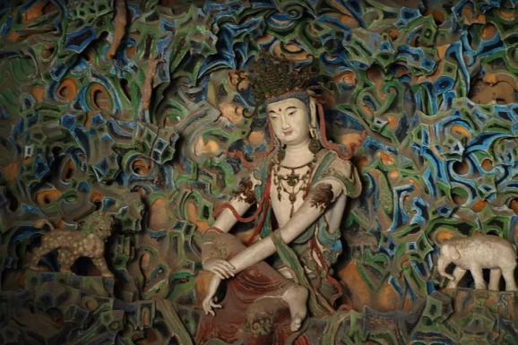 她被鲁迅称为“东方美神”。面目清秀,风眼微睁、面露微笑、右足踏莲、两手抱膝,每一个小细节都描绘的精致无比,活灵活现。