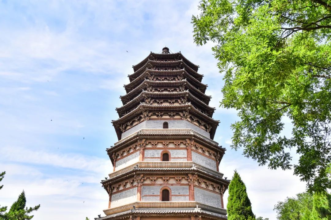 塔高约41米,是四塔之中最大的一座,结构为砖木混合,也被称为“木塔”。塔身第四层中心部位竖立着一根直达塔顶的木质通天柱,这样的结构国内仅此一例,十分珍贵。