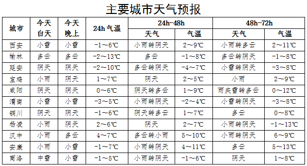 26日:全省阴天转多云,关中东部、陕南大部有小雨或雨夹雪;陕北有4~5级偏南风,阵风可达6级。27日:全省多云转阴天,陕北西部、宝鸡有雨夹雪或小雪,陕南西部有小雨;陕北大部、关中北部有4~5级偏南风,阵风可达6级。28日:全省阴天,陕北大部有小雨或雨夹雪,关中、陕南大部有小雨,秦岭山区有雨夹雪或小雪,陕北大部有4~5级偏北风。