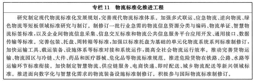 ——现代物流发展制度环境更加完善。物流标准规范体系进一步健全,标准化、集装化、单元化物流装载器具和包装基础模数广泛应用。社会物流统计体系、信用体系更加健全,营商环境持续优化,行业协同治理体系不断完善、治理能力显著提升。