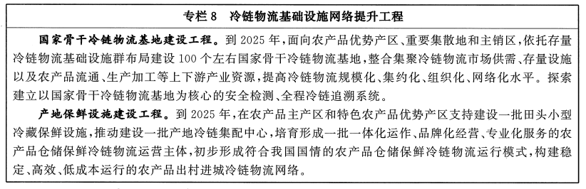 提高冷链物流质量效率。大力发展铁路冷链运输和集装箱公铁水联运,对接主要农产品产区和集散地,创新冷链物流干支衔接模式。发展“生鲜电商+产地直发”等冷链物流新业态新模式。推广蓄冷箱、保温箱等单元化冷链载器具和标准化冷藏车,促进冷链物流信息互联互通,提高冷链物流规模化、标准化水平。依托国家骨干冷链物流基地、产销冷链集配中心等大型冷链物流设施,加强生鲜农产品检验检疫、农兽药残留及防腐剂、保鲜剂、添加剂合规使用等质量监管。研究推广应用冷链道路运输电子运单,加强产品溯源和全程温湿度监控,将源头至终端的冷链物流全链条纳入监管范围,提升冷链物流质量保障水平。健全进口冷链食品检验检疫制度,筑牢疫情外防输入防线。