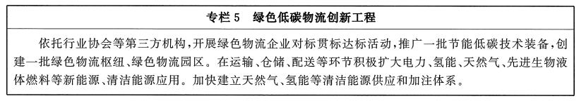 深入推进物流领域节能减排。加强货运车辆适用的充电桩、加氢站及内河船舶适用的岸电设施、液化天然气(LNG)加注站等配套布局建设,加快新能源、符合国六排放标准等货运车辆在现代物流特别是城市配送领域应用,促进新能源叉车在仓储领域应用。继续加大柴油货车污染治理力度,持续推进运输结构调整,提高铁路、水路运输比重。推动物流企业强化绿色节能和低碳管理,推广合同能源管理模式,积极开展节能诊断。加强绿色物流新技术和设备研发应用,推广使用循环包装,减少过度包装和二次包装,促进包装减量化、再利用。加快标准化物流周转箱推广应用,推动托盘循环共用系统建设。