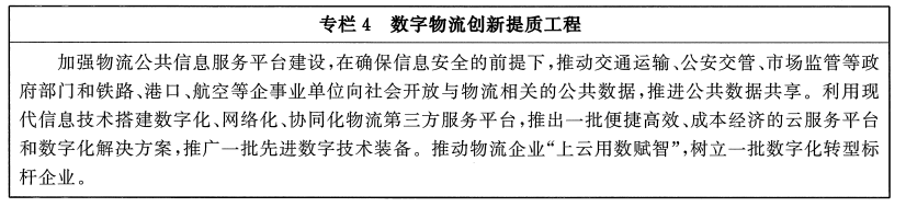 ——物流创新发展能力和企业竞争力显著增强。物流数字化转型取得显著成效,智慧物流应用场景更加丰富。物流科技创新能力不断增强,产学研结合机制进一步完善,建设一批现代物流科创中心和国家工程研究中心。铁路、民航等领域体制改革取得显著成效,市场活力明显增强,形成一批具有较强国际竞争力的骨干物流企业和知名服务品牌。