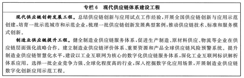 提升现代供应链运行效率。推进重点产业供应链体系建设,发挥供应链核心企业组织协同管理优势,搭建供应链协同服务平台,提供集贸易、物流、信息等多样化服务于一体的供应链创新解决方案,打造上下游有效串接、分工协作的联动网络。加强数字化供应链前沿技术、基础软件、先进模式等研究与推广,探索扩大区块链技术应用,提高供应链数字化效率和安全可信水平。规范发展供应链金融,鼓励银行等金融机构在依法合规、风险可控的前提下,加强与供应链核心企业或平台企业合作,丰富创新供应链金融产品供给。