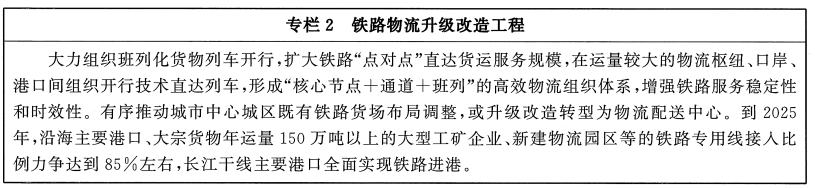 推进结构性降成本。加快推进铁路专用线进港区、连园区、接厂区,合理有序推进大宗商品等中长距离运输“公转铁”、“公转水”。完善集装箱公铁联运衔接设施,鼓励发展集拼集运、模块化运输、“散改集”等组织模式,发挥铁路干线运输成本低和公路网络灵活优势,培育有竞争力的“门到门”公铁联运服务模式,降低公铁联运全程物流成本。统筹沿海港口综合利用,提升大型港口基础设施服务能力,提高码头现代化专业化规模化水平,加快推进铁水联运衔接场站改造,提高港口铁路专用线集疏网络效能,优化作业流程。完善内河水运网络,统筹江海直达、江海联运发展,发挥近海航线、长江水道、珠江水道等水运效能,稳步推进货物运输“公转水”。推进铁水联运业务单证电子化,促进铁路、港口信息互联,实现铁路现车、装卸车、货物在途、到达预确报以及港口装卸、货物堆存、船舶进出港、船期舱位预定等铁水联运信息交换共享。支持港口、铁路场站加快完善集疏运油气管网,有效对接石化等产业布局,提高管道运输比例。