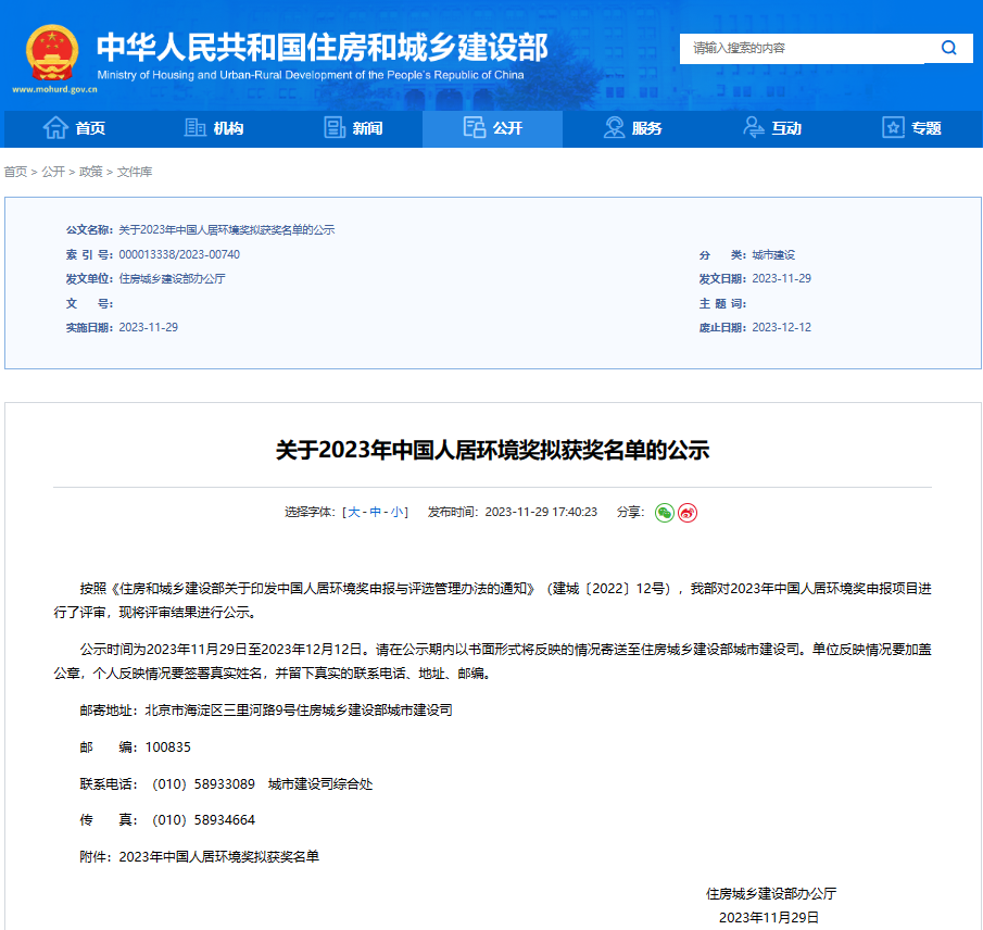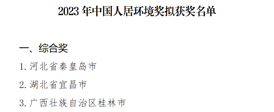 2023年11月29日,住建部网站发布《关于2023年中国人居环境奖拟获奖名单的公示》,桂林被授予2023年“中国人居环境奖(综合)”荣誉。