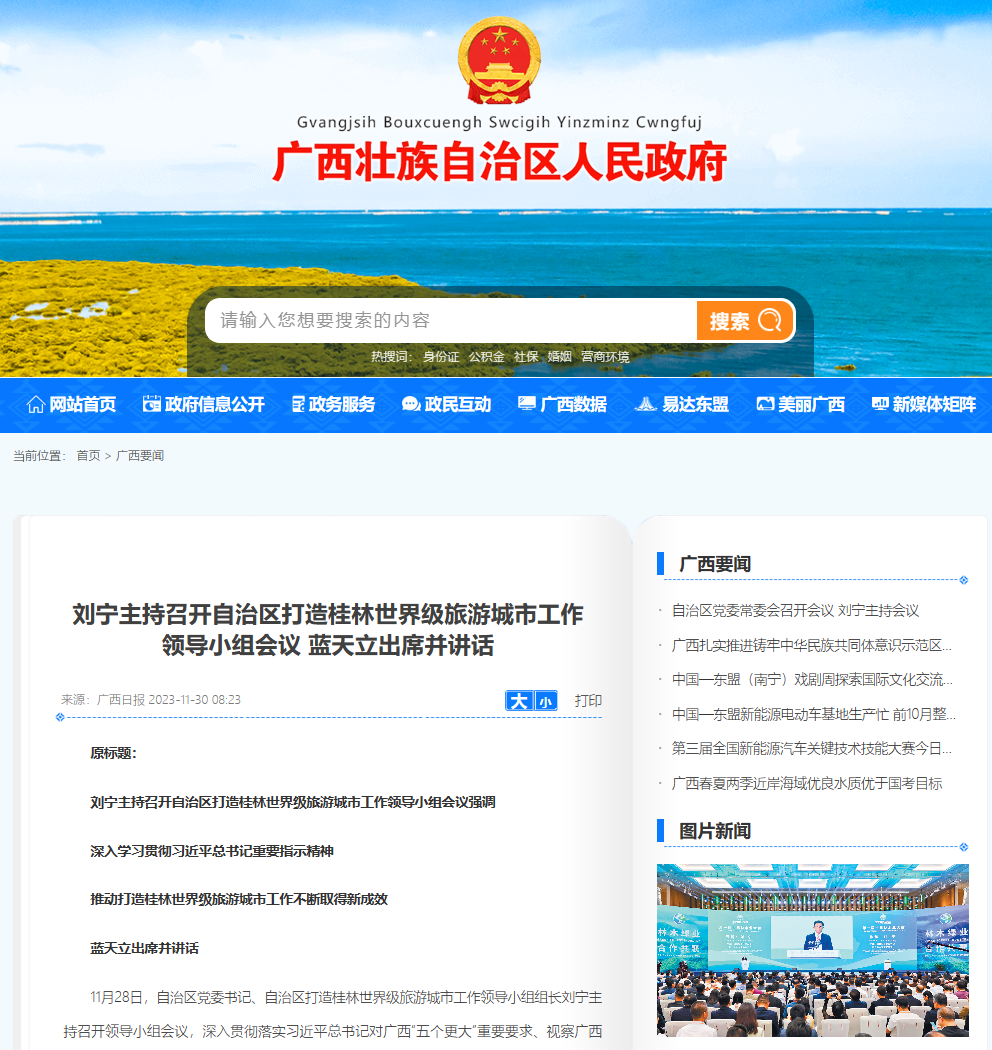 11月28日,广西自治区党委书记、自治区打造桂林世界级旅游城市工作领导小组组长刘宁主持召开领导小组会议,会议提出,要抓住国务院批复实施规划的重大机遇,坚持世界眼光、国际标准、中国风范、广西特色、桂林经典,加快建设山水甲天下的旅游名城人与自然和谐共生的生态名城世界文明交流互鉴的开放名城宜业宜居宜乐宜游的品质生活名城