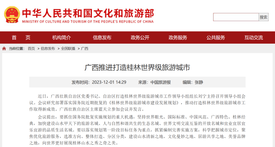 2023年9月11日,国务院批复同意国家发展改革委上报的《桂林世界级旅游城市建设发展规划》,相关支持政策已编制完成并正式上报国务院。此前,打造桂林世界级旅游城市已被列入“十四五”全国旅游业发展规划,上升到国家层面。