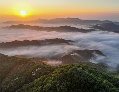 8月23日清晨,河北省遵化市北部山区云蒸霞蔚,朝霞、云海映衬着古长城,宏伟壮观。