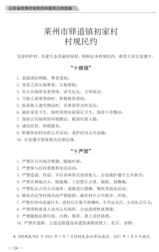 莱州市驿道镇初家村村规民约入选山东省优秀村规民约。