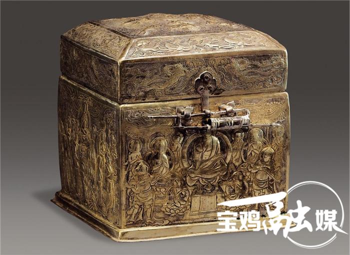 图为鎏金如来说法盝顶银宝函正面