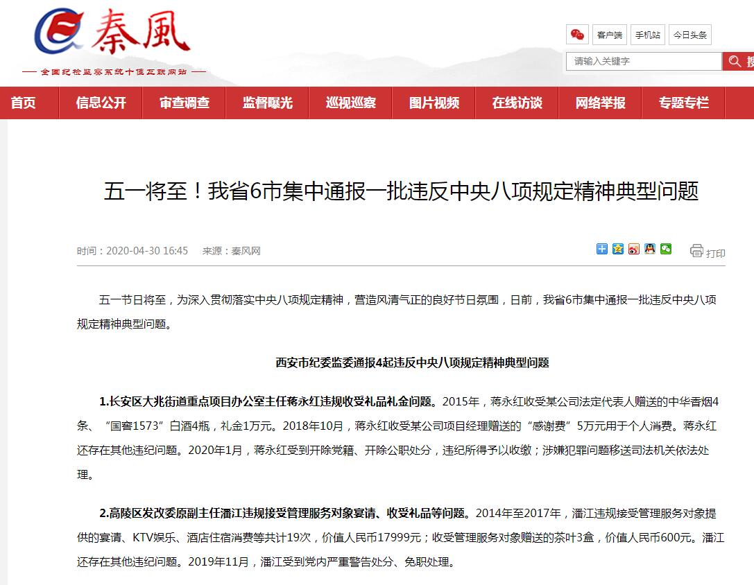 西安市纪委监委通报4起违反中央八项规定精神典型问题