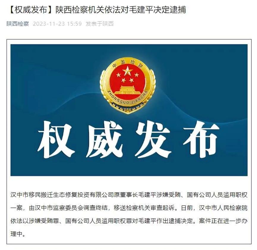 据陕西检察消息,汉中市移民搬迁生态修复投资有限公司原董事长毛建平涉嫌受贿、国有公司人员滥用职权一案,由汉中市监察委员会调查终结,移送检察机关审查起诉。日前,汉中市人民检察院依法以涉嫌受贿罪、国有公司人员滥用职权罪对毛建平作出逮捕决定。案件正在进一步办理中。