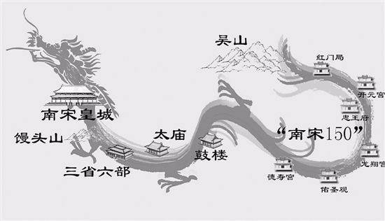 在版图上,如果画上一条龙,“南宋150”体验线路就清晰可见:龙头位置,就在南宋皇城遗址,“龙身”由馒头山、三省六部、太庙、鼓楼、德寿宫、佑圣观、龙翔宫、忠王府、开元宫、红门局等各个点串起,还蛮有点“龙脉”的意思。