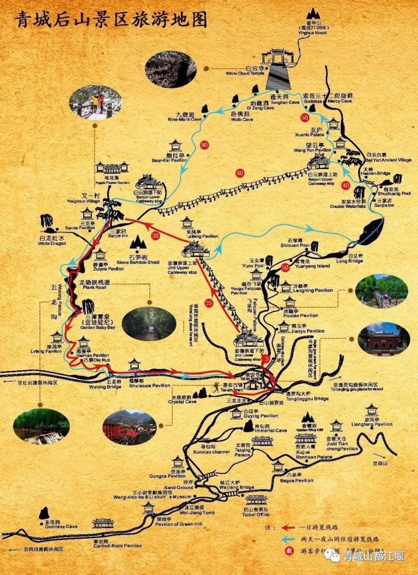 推荐路线(索道上步行下):青城山山门→雨亭→月城湖→青城山索道→上清宫→老君阁→九道拐→朝阳洞→掷笔槽→天师洞→五洞天→凝翠桥→天然图画→天然阁→青城山山门