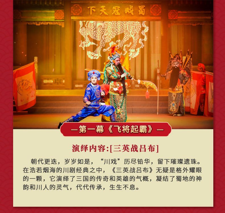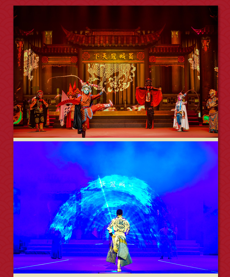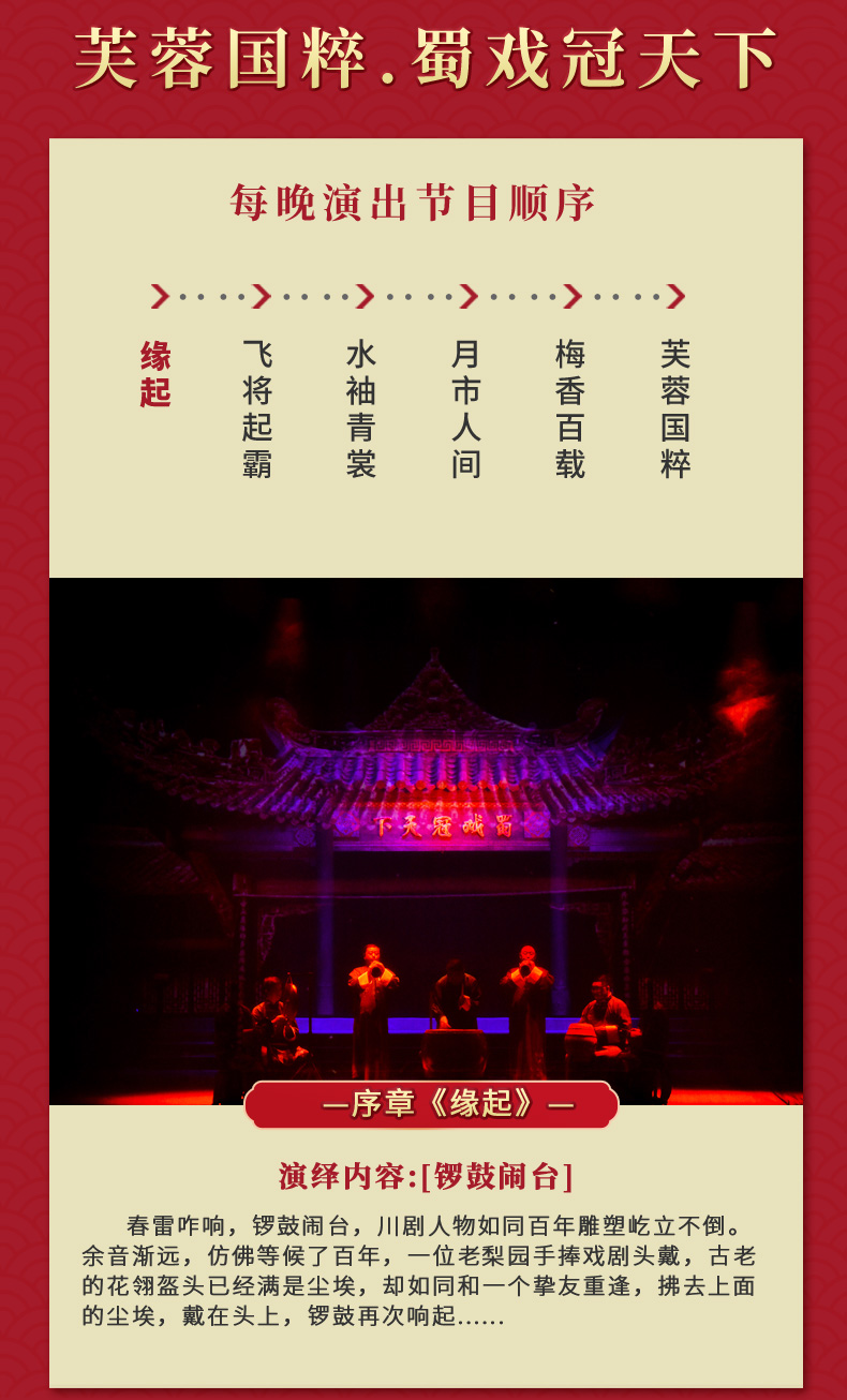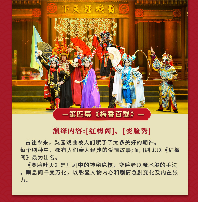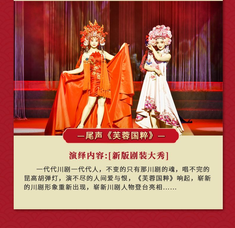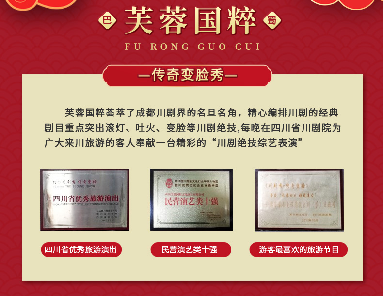 ·《芙蓉国粹·川剧秀传奇变脸》是一台全国首创以川剧元素为主体,展现成都风土人情的情景剧。 ·该剧讲述了两位明末清初的川剧艺人悲欢离合的爱情故事。 ·在该剧演出中你将观赏到精典折子戏片断,领略到川剧演员唱、念、坐、打的基本功。 ·该剧将川剧的所有绝技表演展现其中,特别是川剧变脸、吐火、木偶变脸吐火、变服装等等。