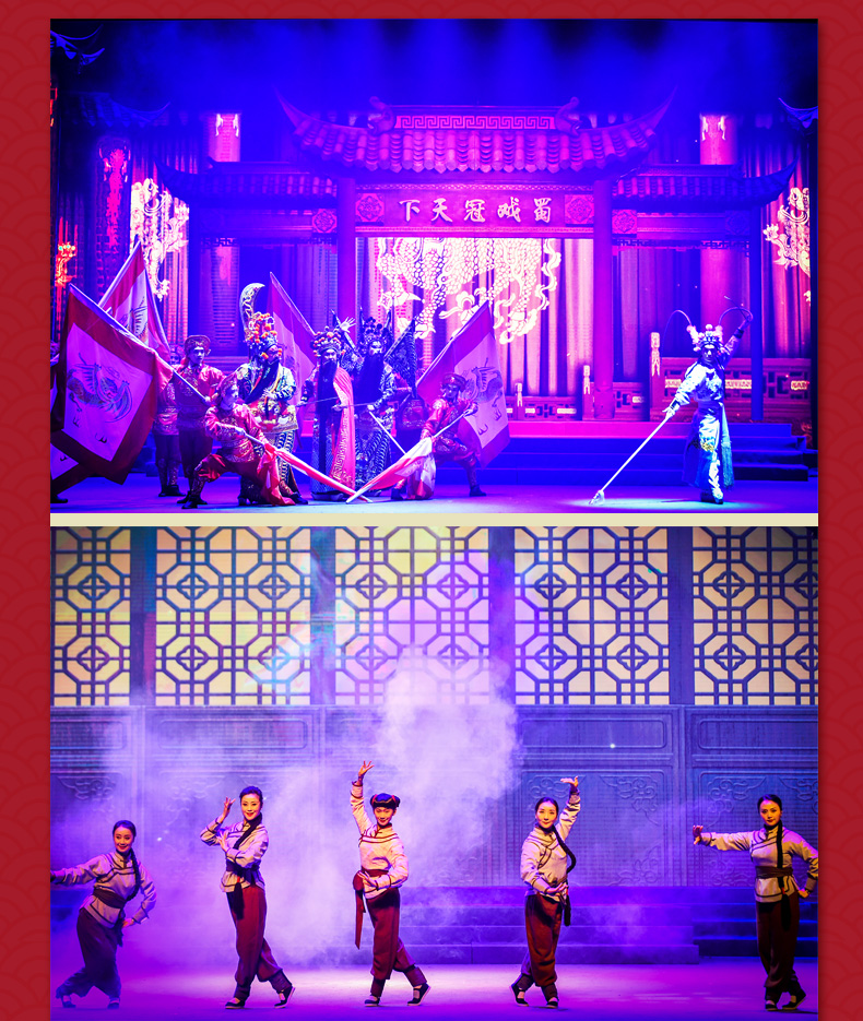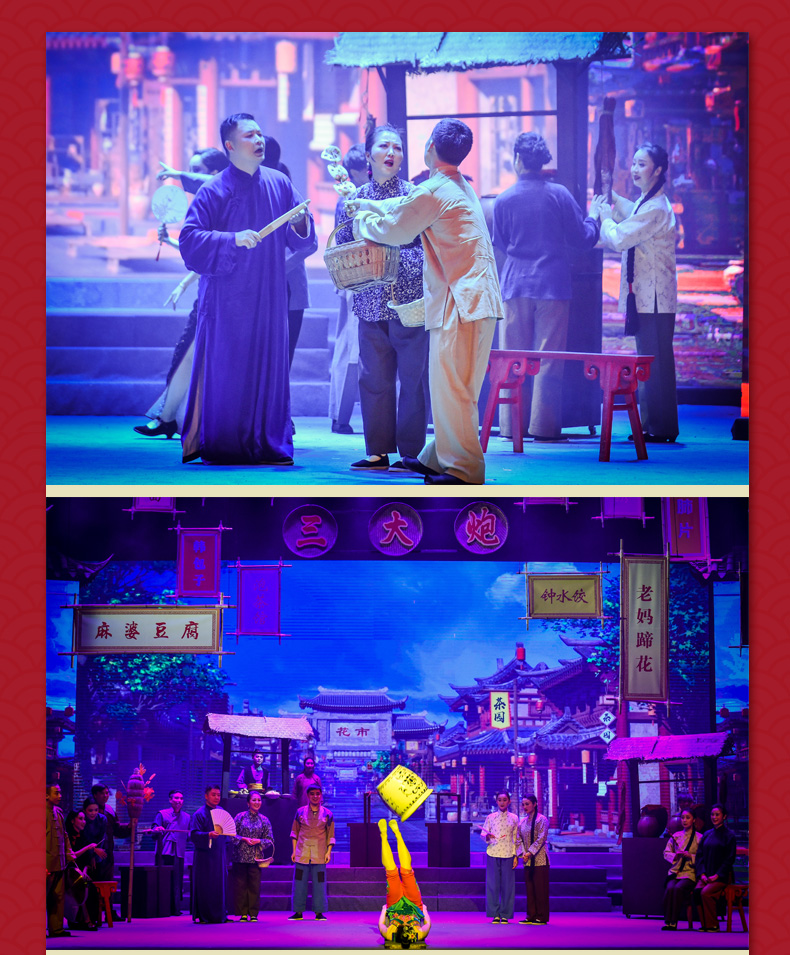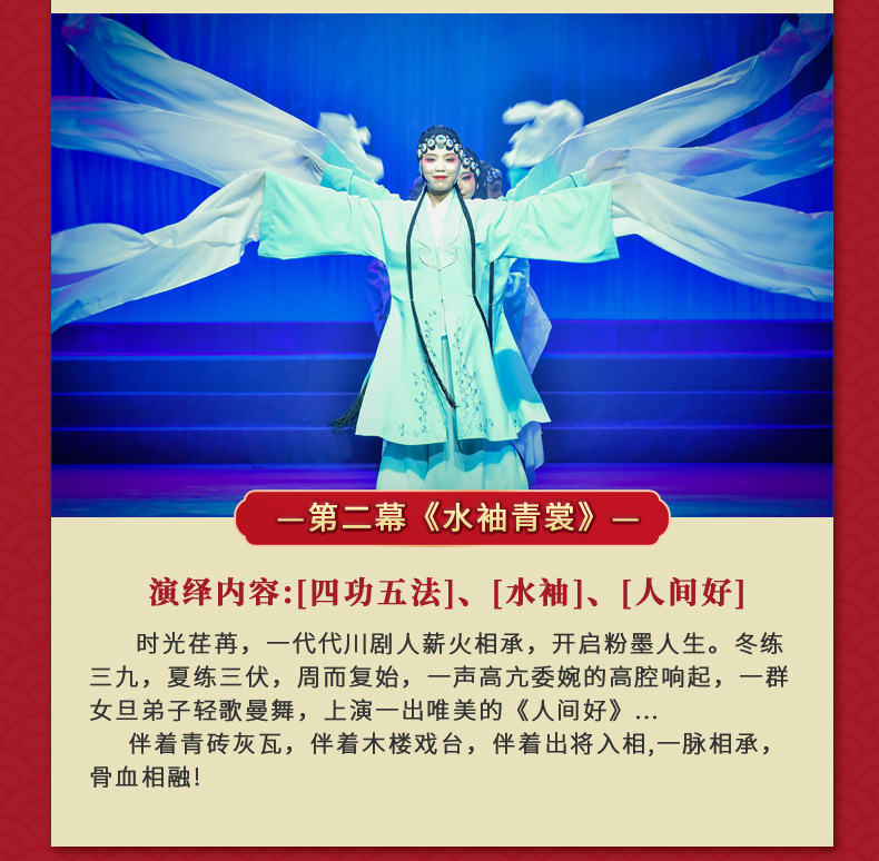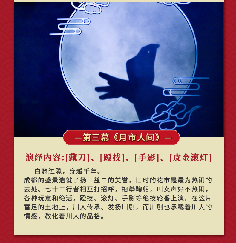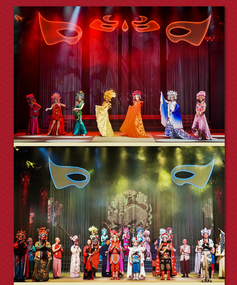 ·《芙蓉国粹·川剧秀传奇变脸》是一台全国首创以川剧元素为主体,展现成都风土人情的情景剧。 ·该剧讲述了两位明末清初的川剧艺人悲欢离合的爱情故事。 ·在该剧演出中你将观赏到精典折子戏片断,领略到川剧演员唱、念、坐、打的基本功。 ·该剧将川剧的所有绝技表演展现其中,特别是川剧变脸、吐火、木偶变脸吐火、变服装等等。