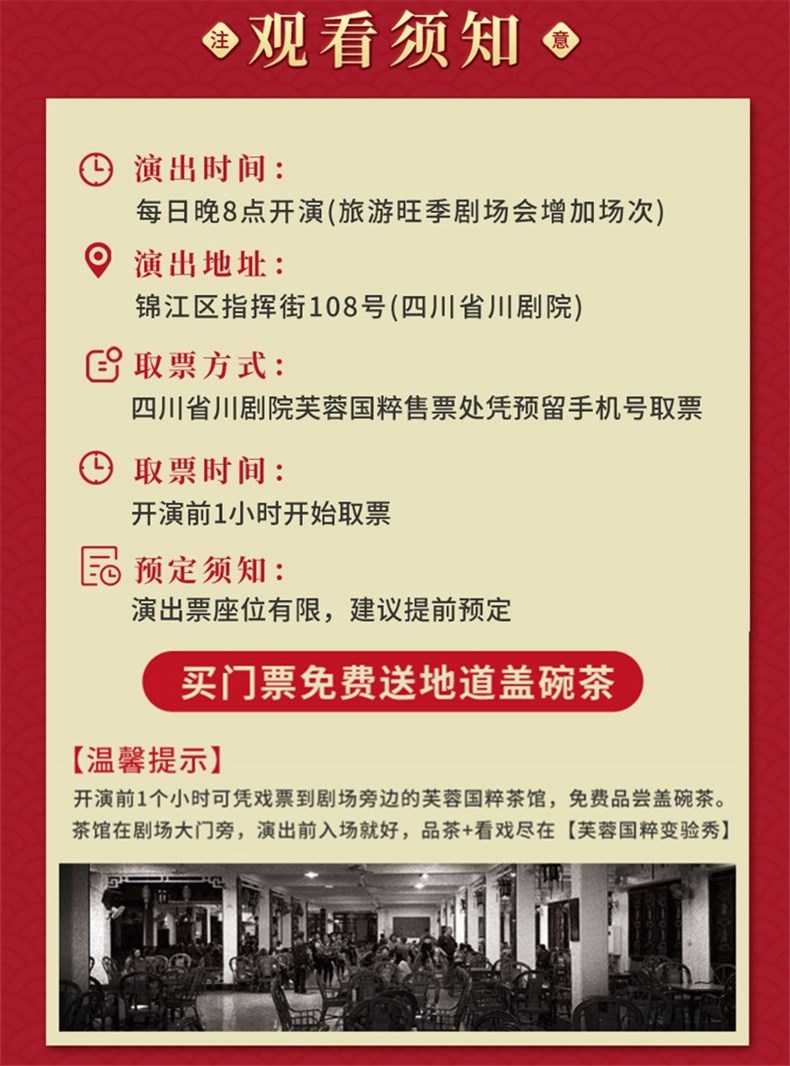1. 取票方式:芙蓉国粹演出观看当晚19:00-20:00在剧场售票处报名字+手机号取票(演出地址:成都市指挥街108号四川省川剧院); 2. 芙蓉国粹赠送芙蓉茶馆盖碗茶一份(开演前1小时可凭票在剧场旁边的芙蓉茶馆,免费喝盖碗茶,感受老成都茶馆风味); 3. 芙蓉国粹演出时间:平时一场晚20:00开演,旺季2场,19:00和20:30各一场,具体依剧场规定为准; 4.温馨提示:此产品为二次确认产品,剧场每天座位有限,如遇当日场次无票,我们客服会联系您协商改票,改期或者全款退回,谢谢您的配合!