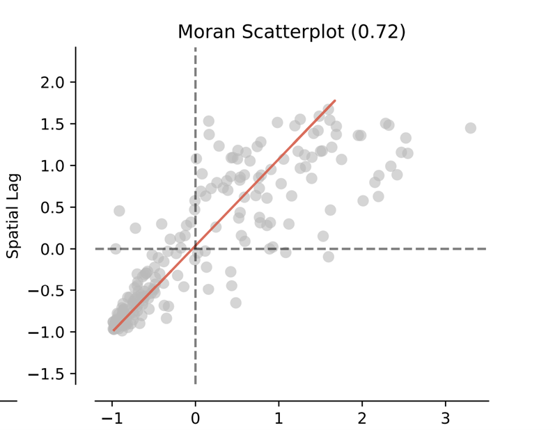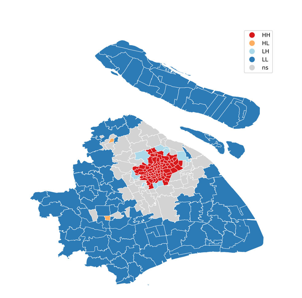 图2  上海各街镇人口密度与其周边街镇的高度自相关,莫兰指数为0.72