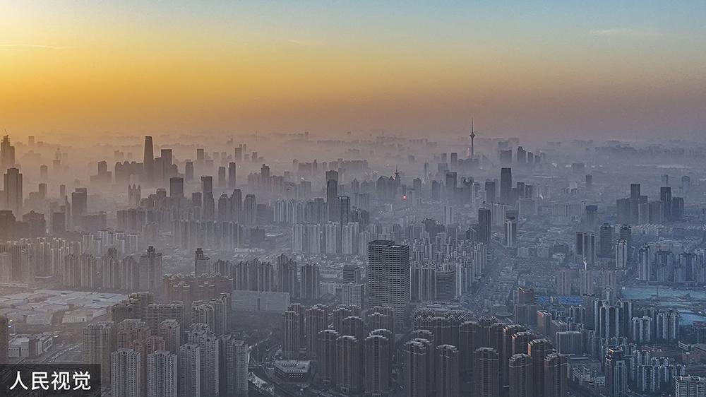 2021年12月20日清晨,天津迎来雾霾天气,日出中的城市一片朦胧。本文图片 人民视觉