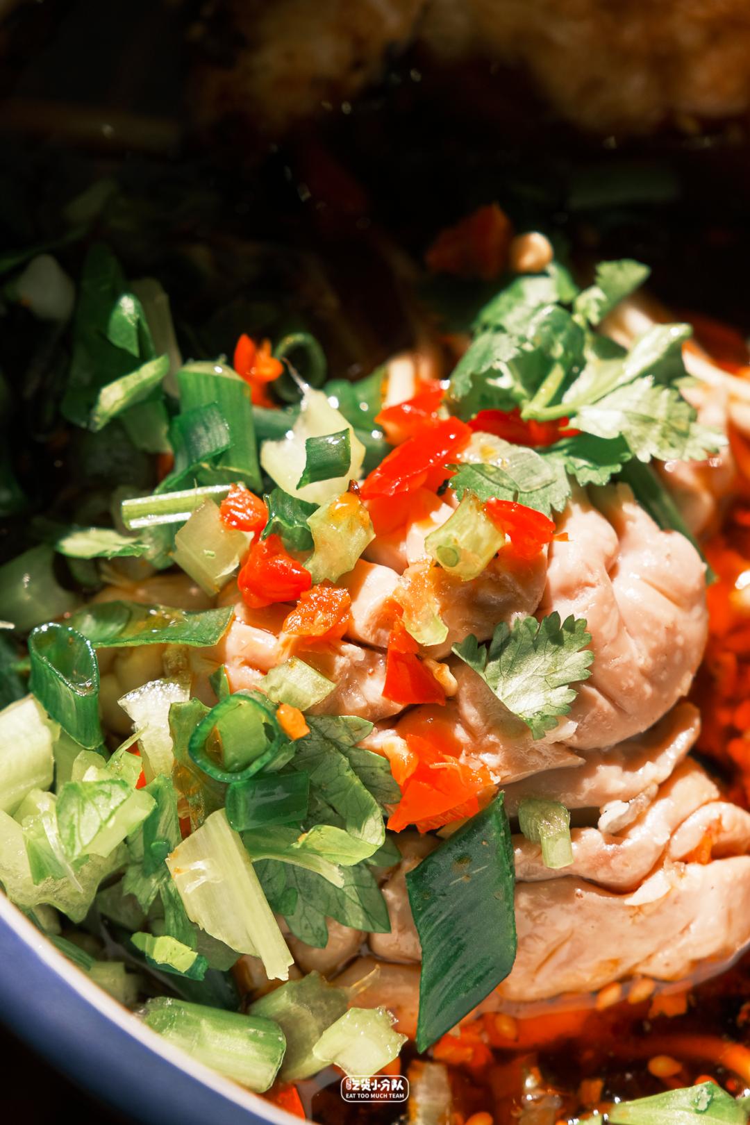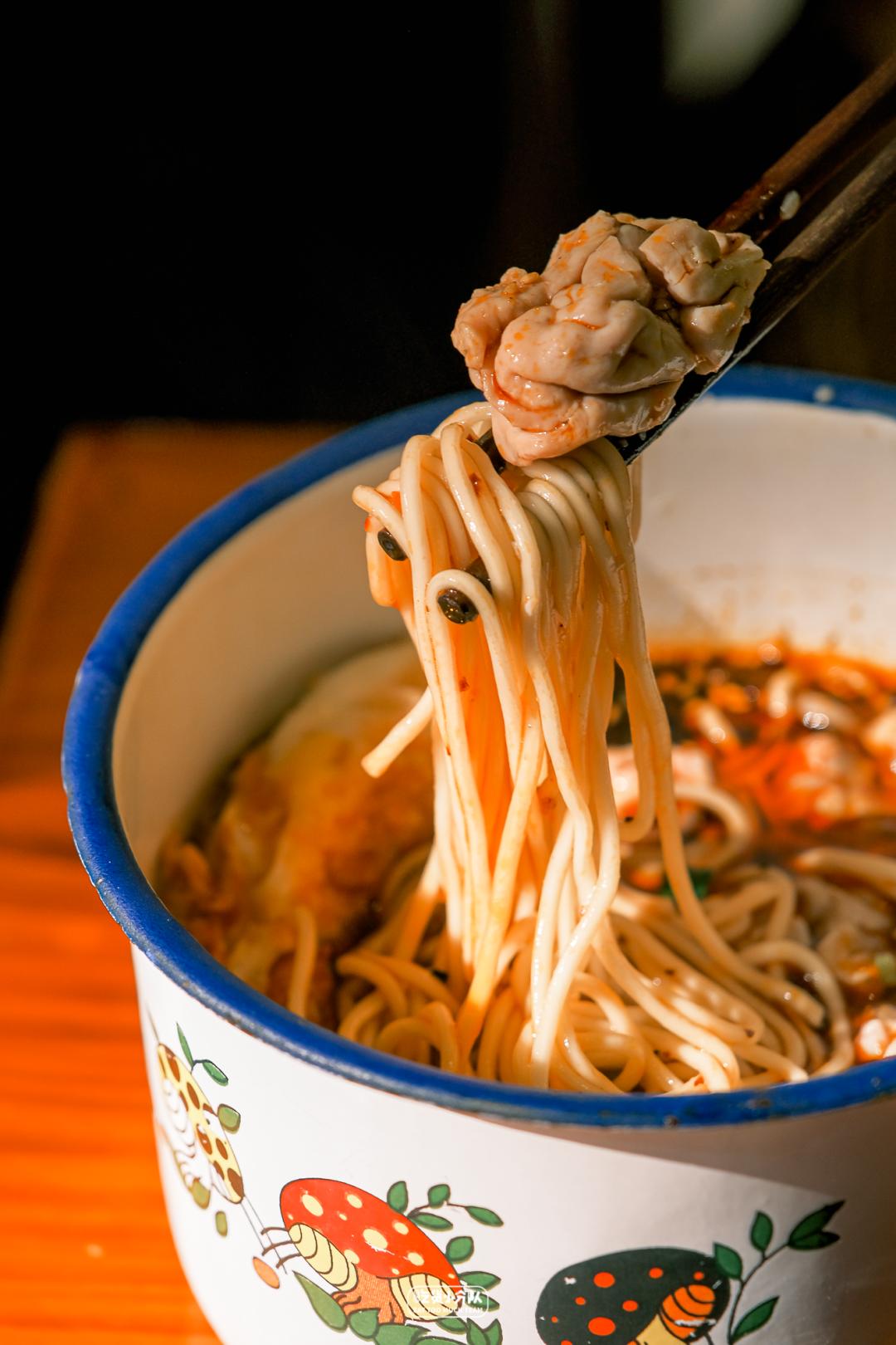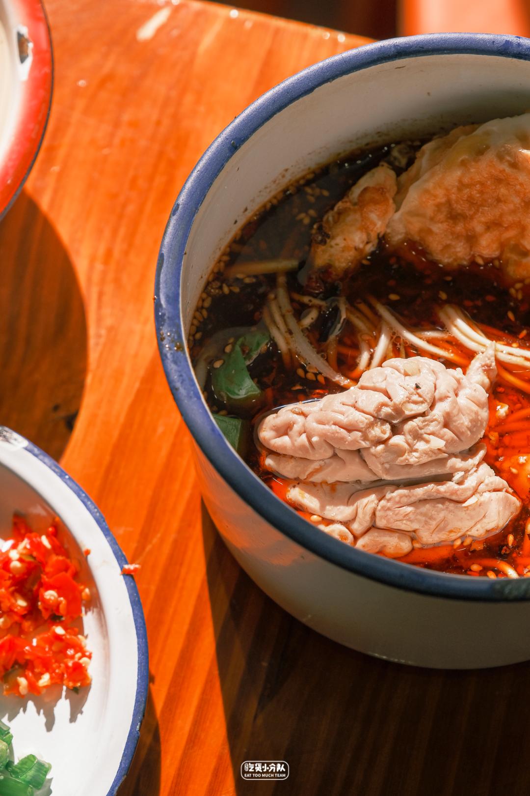 曾一度在社交网站被疯传的脑花面,号称是正宗川渝口味,店里除了脑花面外,钵钵鸡、凉糕也是正统的四川风味。招牌脑花面被装在搪瓷碗里的,1面1脑,不够吃还能另加。脑花要煮满15分钟,香辣入味,筋膜和血管全都被剔除干净,口感只剩绵密丝滑,腥味也随之淡化。