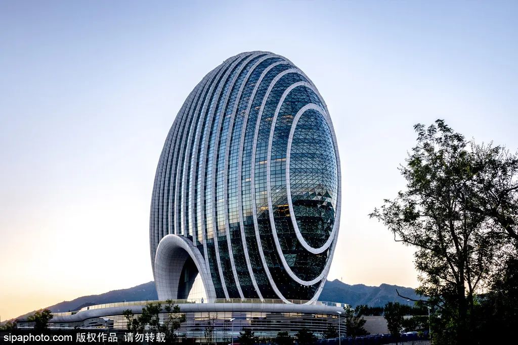 北京日出东方凯宾斯基酒店坐落于雁栖湖畔,从正面看,酒店建筑外形宛如一轮冉冉升起的太阳;从侧面看,酒店建筑呈扇贝形状,扇贝在中国古代文化中代表“财富”,配合酒店建筑正面的“旭日东升”之寓意,整个酒店建筑寓意蓬勃发展。