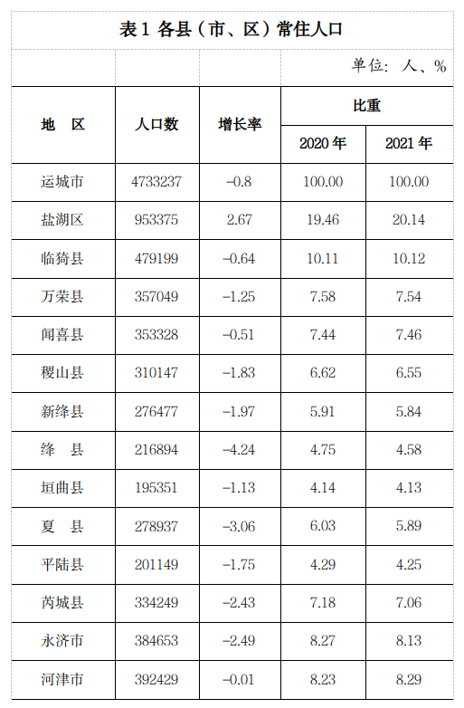 分区域看,中心城区人口集聚趋势明显。全市13个县(市、区)中,盐湖区常住人口953375人,比上年增加24801人,增幅为2.67%,盐湖区人口占全市人口比重由19.46%增至20.14%。除盐湖区人口增加外,其余各县市常住人口均有所下降,与2020年相比,减少比例最大的是绛县,减少人数为9610人,下降4.24%。