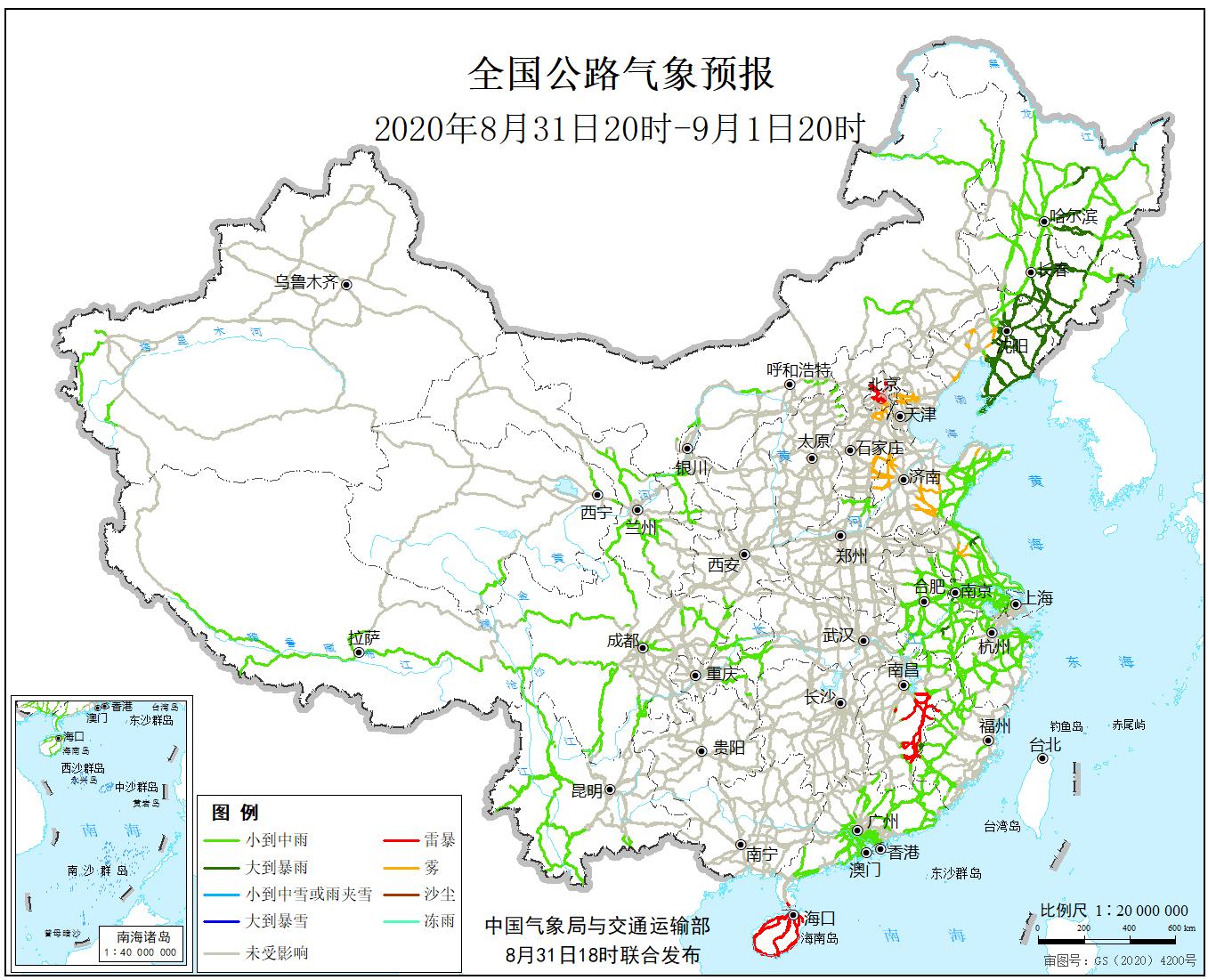 中国气象局与交通运输部2020年8月31日联合发布全国主要公路气象预报