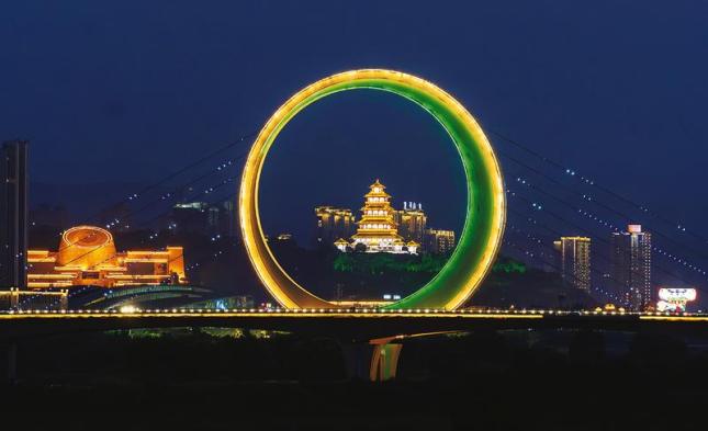 夜幕降临之际,市区石鼓山上的石鼓阁和团结渭河大桥上的灯光次第亮起,团结大桥上“日月同辉”中的石鼓阁就映入眼帘,旁边的青铜器博物院同样灯火辉煌,共同构成流光溢彩的美丽夜景。