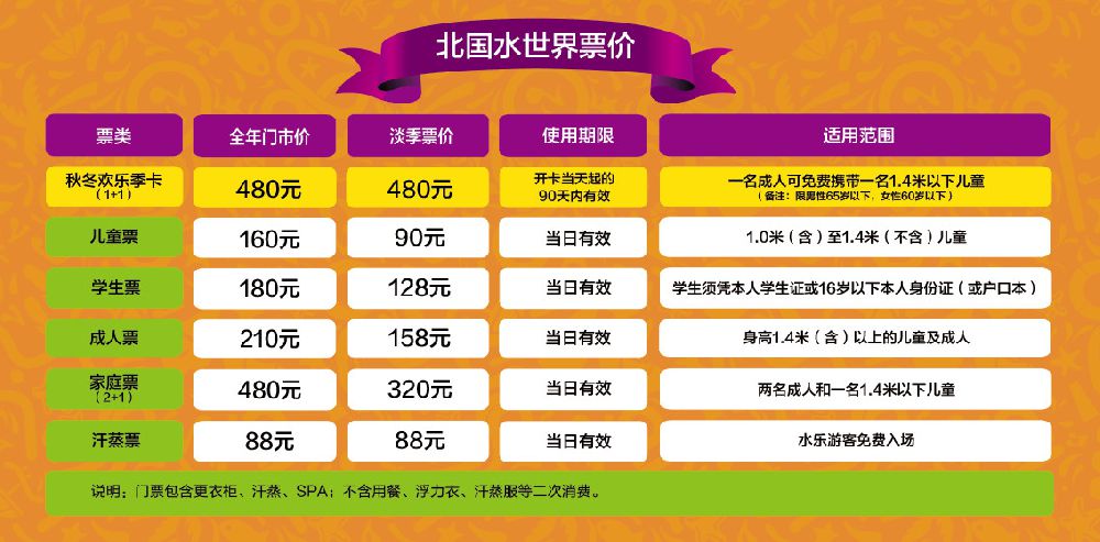 北国水世界家庭门市价(2+1):480元,淡季票价320元,适用范围:两名成人和一名1.4米以下儿童