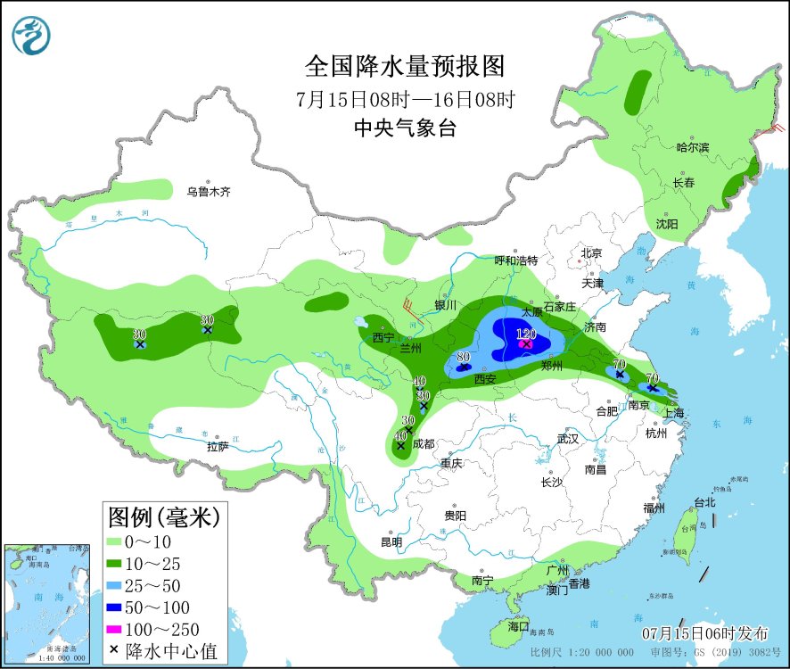 7月15日08时至16日08时,甘肃东部、陕西中部、山西南部、河南北部以及安徽东北部、江苏西部和南部等地部分地区有大到暴雨,其中,山西南部等地局地有大暴雨(100~120毫米)(见图3)。