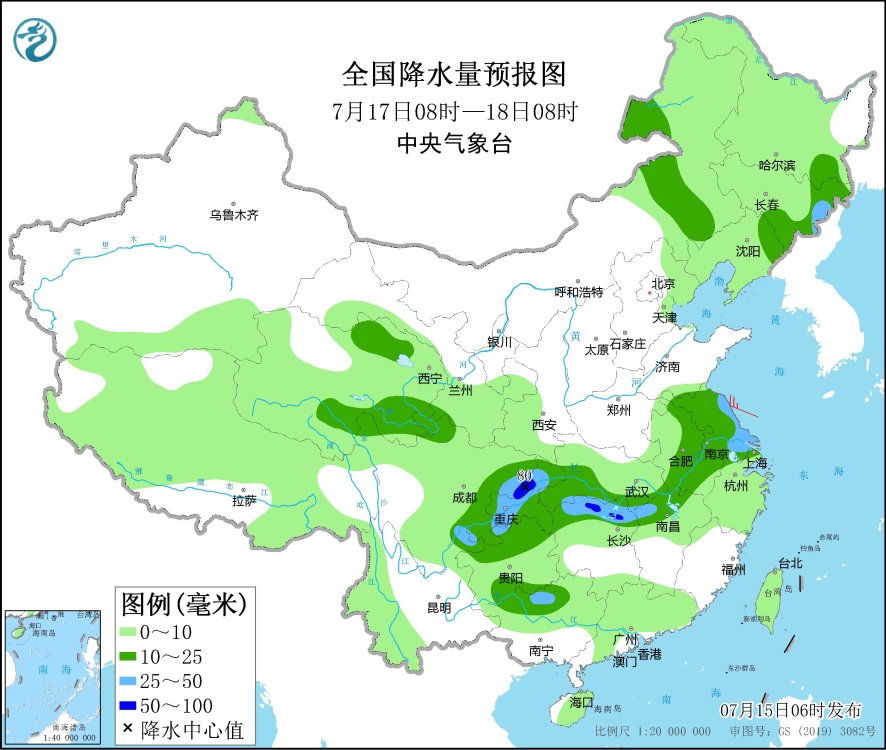 7月17日08时至18日08时,内蒙古东北部、吉林东部、青海东北部和南部、江淮大部、江南北部、川西高原北部、西南地区东部、广西西北部等地部分地区有中到大雨,局地有暴雨(50~80毫米)(见图5)。