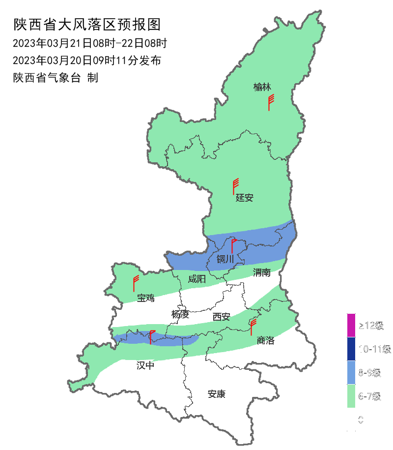预计21日 陕北、关中、陕南东部有4~5级偏北风、阵风6~7级,其中关中北部、秦岭山区局地阵风可达8级以上,陕北、关中伴有扬沙或浮尘天气。