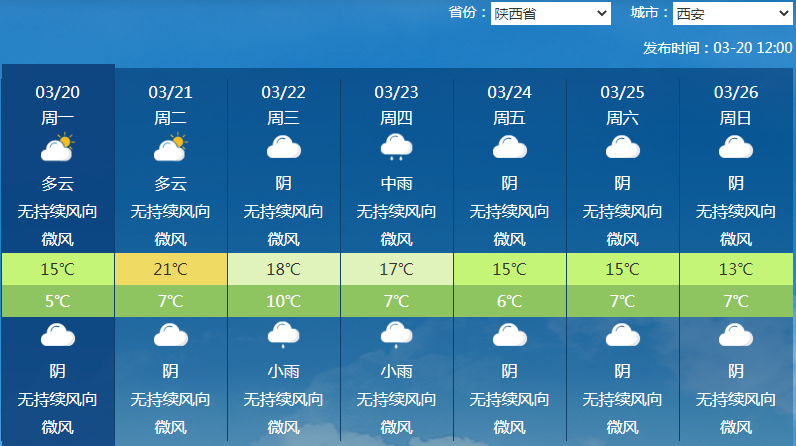21日: 全省多云间阴天,陕北西部部分地方、陕南南部局地有小雨。陕北、关中北部有4~5级偏北风,局地阵风可达7级以上,陕北部分地方有浮尘或扬沙。陕北西部日平均气温下降4℃左右。