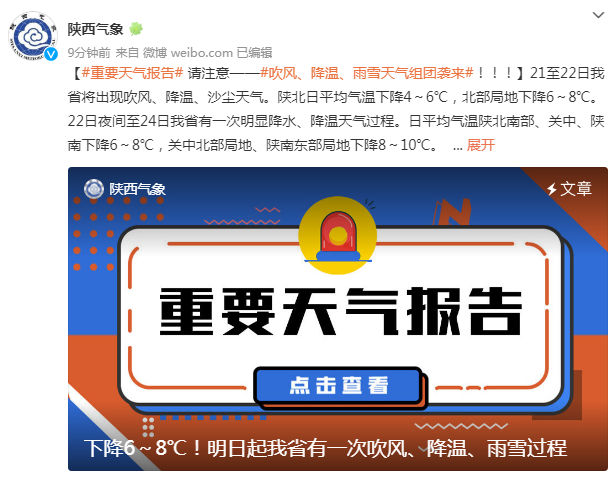22日 陕北日平均气温下降4~6℃,北部局地下降6~8℃。