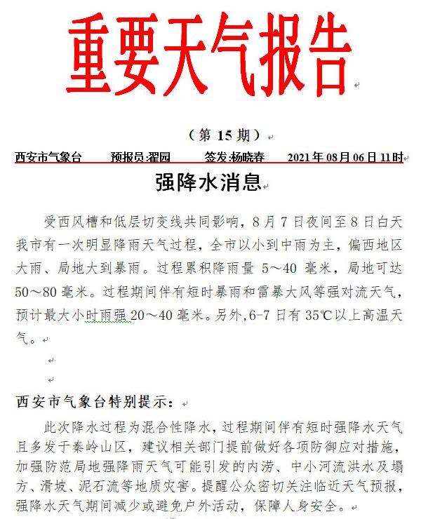 西安市气象台2021年08月06日11时发布强降水消息:受西风槽和低层切变线共同影响,8月7日夜间至8日白天西安市有一次明显降雨天气过程,全市以小到中雨为主,偏西地区大雨、局地大到暴雨。过程累积降雨量5~40毫米,局地可达50~80毫米。过程期间伴有短时暴雨和雷暴大风等强对流天气,预计最大小时雨强20~40毫米。另外,6-7日有35℃以上高温天气。